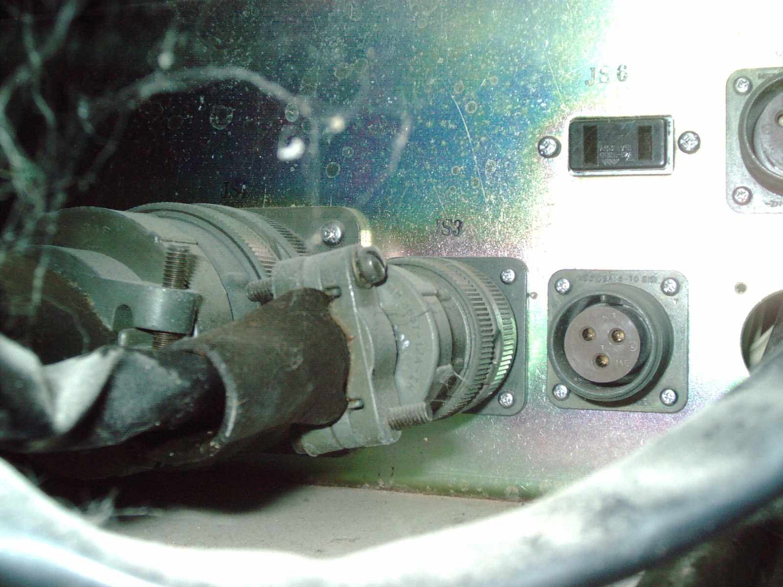 I moved my SX-30 a couple of feet from the wall (lots of dust and junk - cat sleeps on it) to look at the 100V AC power port and vacuum pump port. I followed the ac cord/plug end - and it led to a very low spot on the backside of the SEM. The JS1 location should have a 3-pin port but instead the previous owner jerry-rigged it to be a direct connection. I looked though my small inventory of stuff from the SEM previous owner and found a 3-pin miltary connector - Im glad they saved it. So in the above pictures - Im showing the JS1 port which I believe the previous owner removed and hardwired directly to AC cord.